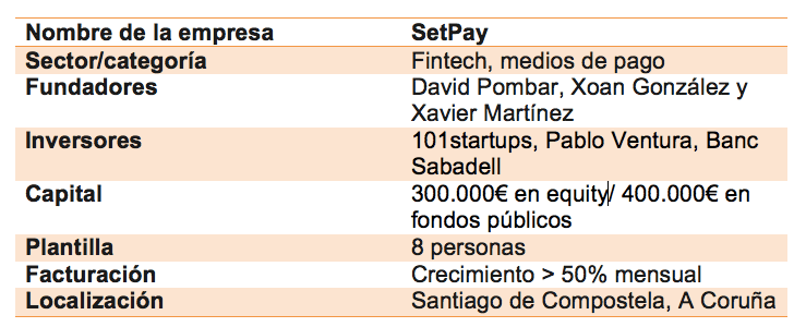 David Pombar (CEO), Xoan Gonzalez (CTO) y Xavier Martinez (CFO), son los  de SetPay, una startup creada en el año 2012, y cuyas operaciones en 2015, presentan un crecimiento de más del 50% mensual. Una idea de negocio, dirigida a los autónomos y empresas, que además en «made in Spain».